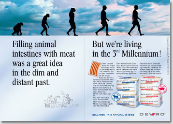 Advertisement for collagen-based sausage casings (main alternative to natural sausage casings).